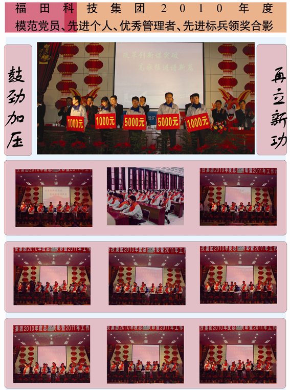 2010年是公司全体干部职工同舟共济、锐意改革、破难攻坚、奋发有为的一年。公司各项事业逆势而上,喜报频传,取得了可喜成绩。成绩的取得是公司全体员工共同努力的结果,尤其离不开在公司各单位、各部门、各岗位上涌现出来的一大批模范党员、优秀管理者、先进个人、先进标兵的无私奉献与默默耕耘。他们,在具体工作中任劳任怨、主动作为、兢兢业业;在组织上听从指挥、服从领导、遵守纪律;在工作作风上雷厉风行、高效精准;在产品质量上认真负责、一丝不苟。他们用自己的实际行动带动着一群人,他们用自己的高尚品格感召着一群人,他们用自己的聪明才智引领着一群人,他们创造价值,书写崇高.....所有这些,构成了他们作为一名普通员工的优良品格和堪称楷模的有力基础,荣誉授予他们当之无愧!希望他们珍惜荣誉、不骄不躁、保持本色、再创佳绩。同时也希望公司全体干部职工以他们的品德为标尺,以他们的成绩为标杆,鼓劲加压,积极作为,勇攀高峰,以更加饱满的热情和更加昂扬的斗志投入到新一年的工作之中,为福田持续、健康、和谐发展做出更大的贡献!