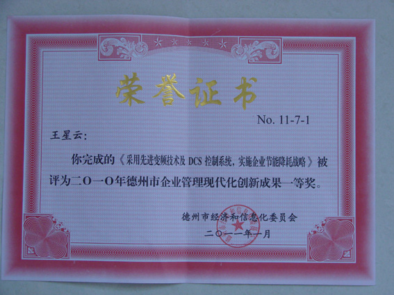 日前,2010年德州市企业管理现代化创新成果评定揭晓,福田科技集团又有两项成果获奖。公司“以节能降耗、控制成本为导向原则的全面预算管理体系的构建与实施”成果被评为特等奖,成果主创人员为王星云、聂永来、王淑兰、孟雯雯;公司“采用先进变频技术及DCS控制系统,实施企业节能降耗战略”成果被评为一等奖第一名,成果主创人员为王星云、聂永来、王成福、孟雯雯。
