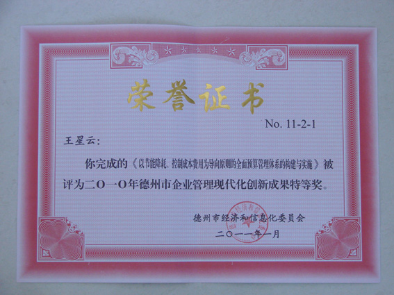 “德州市企业管理现代化创新成果奖”是德州市最权威的管理类奖项,涉及了当前企业管理的各个领域,全面反映了德州市优秀企业在管理创新理论和实践方面取得的最新成就,体现了当前德州市企业管理现代化水平和趋势。
