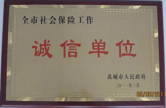 (上图:公司所获“全市社会保险工作诚信单位”荣誉牌匾)