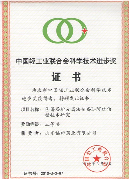 近日,在北京举行的中国轻工业联合会第三次会员代表大会上,颁发了2010年度中国轻工业联合会科技进步奖,根据《中国轻工业联合会科学技术奖励办法》和《中国轻工联合会科学技术奖励办法实施细则》的规定,经中国轻工联合会科学技术奖励专业组评审、中国轻工联合会科学技术奖励委员会审定和中国轻工业联合会批准,我集团的《色谱层析法制备-L阿拉伯糖技术研究》获中国轻工联合会科学技术进步奖三等奖。